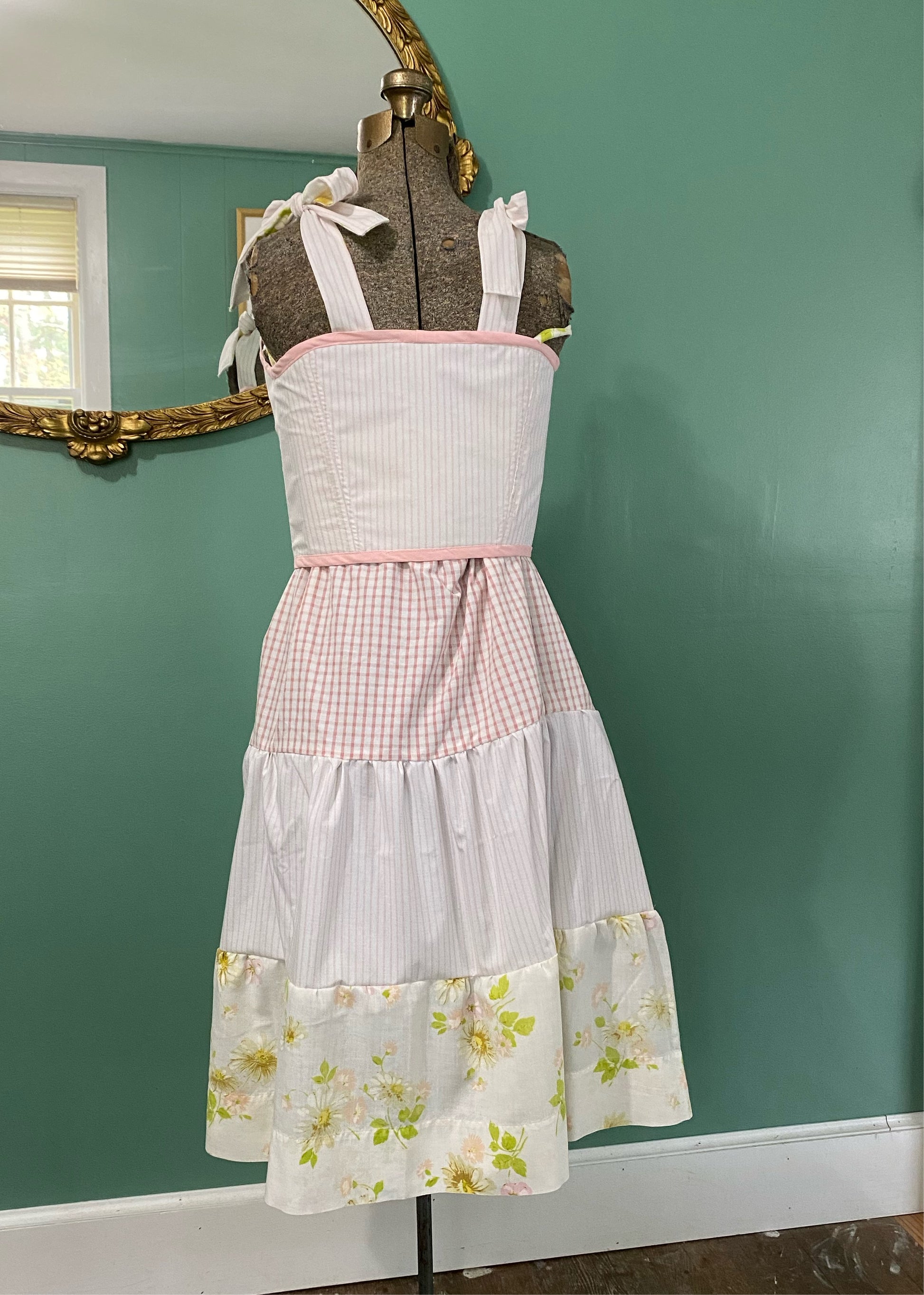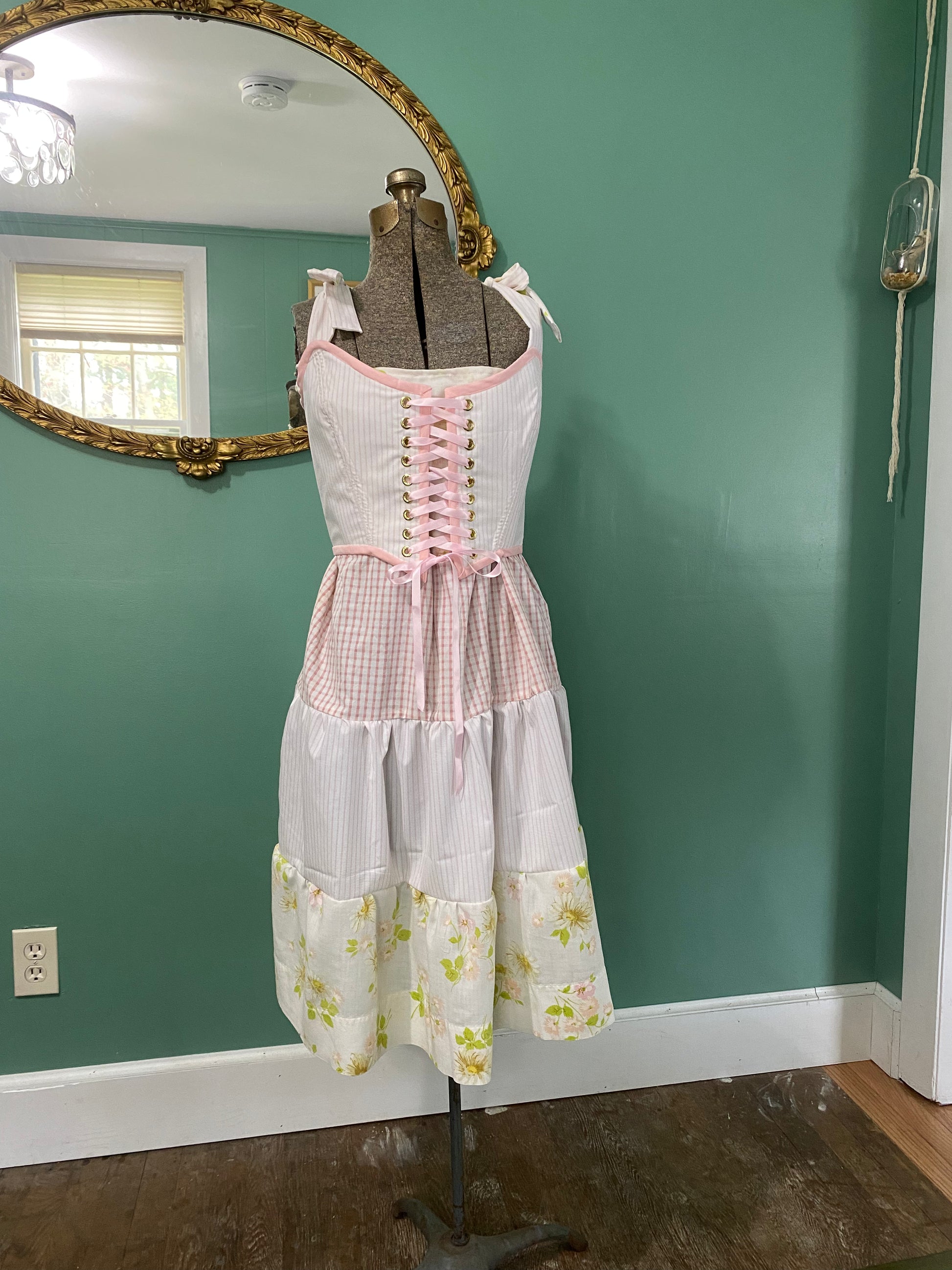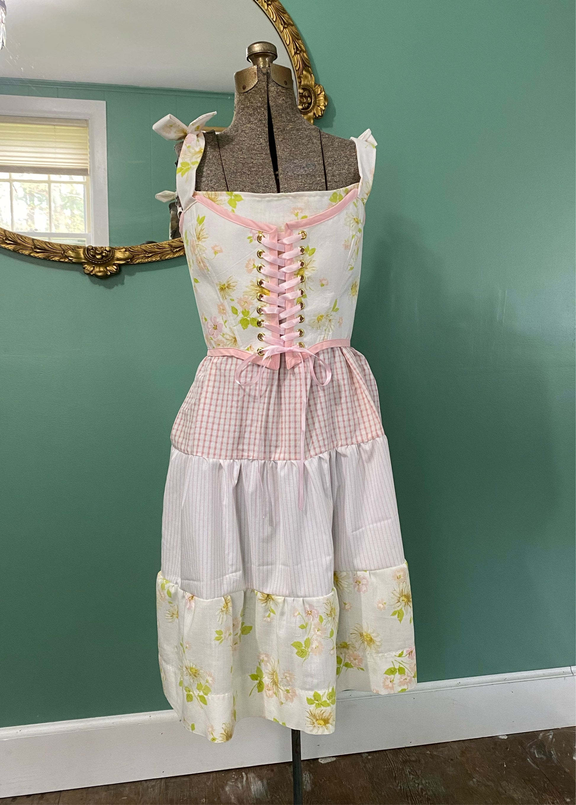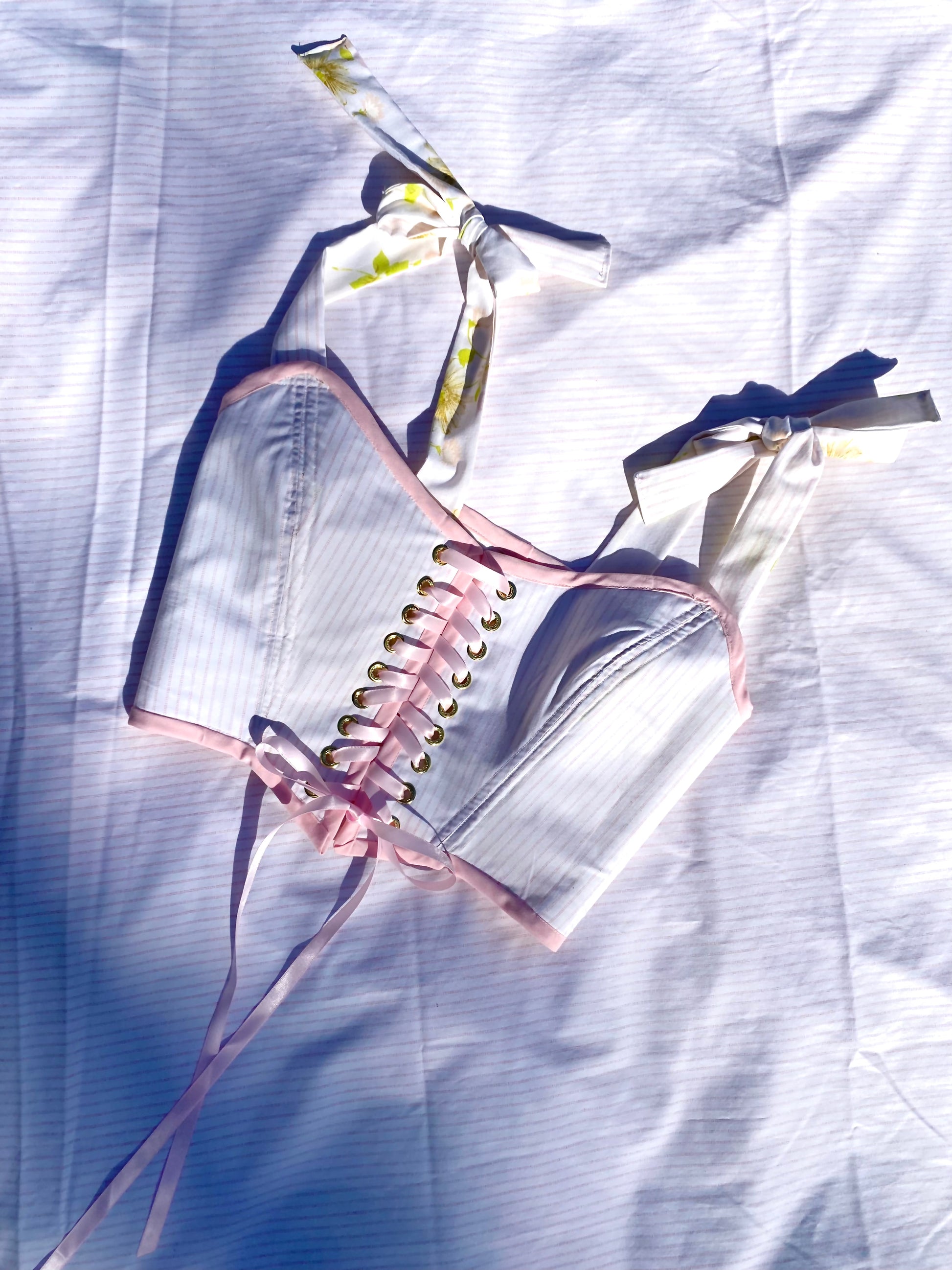 This reversible corset it made from vintage bedsheets, one side is a delicate floral print and the other a pink double pin stripe. It laces up the front for easy dressing and tie straps on the shoulders for an adjustable fit.