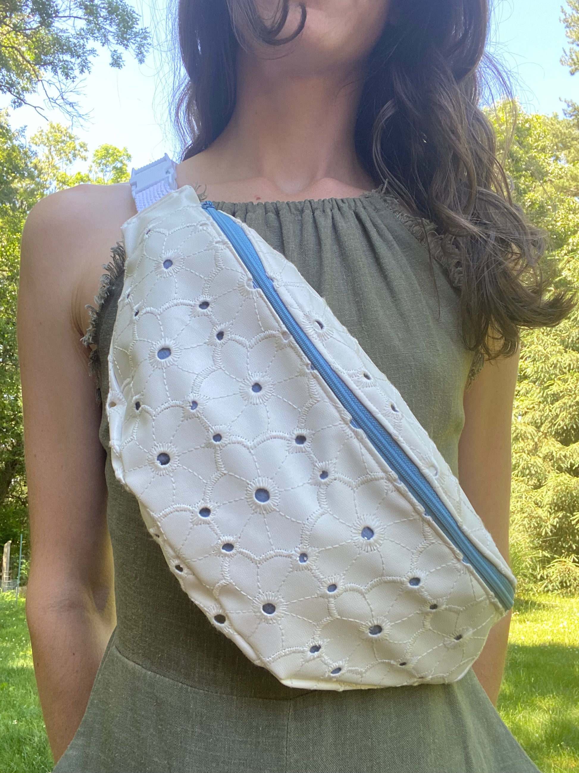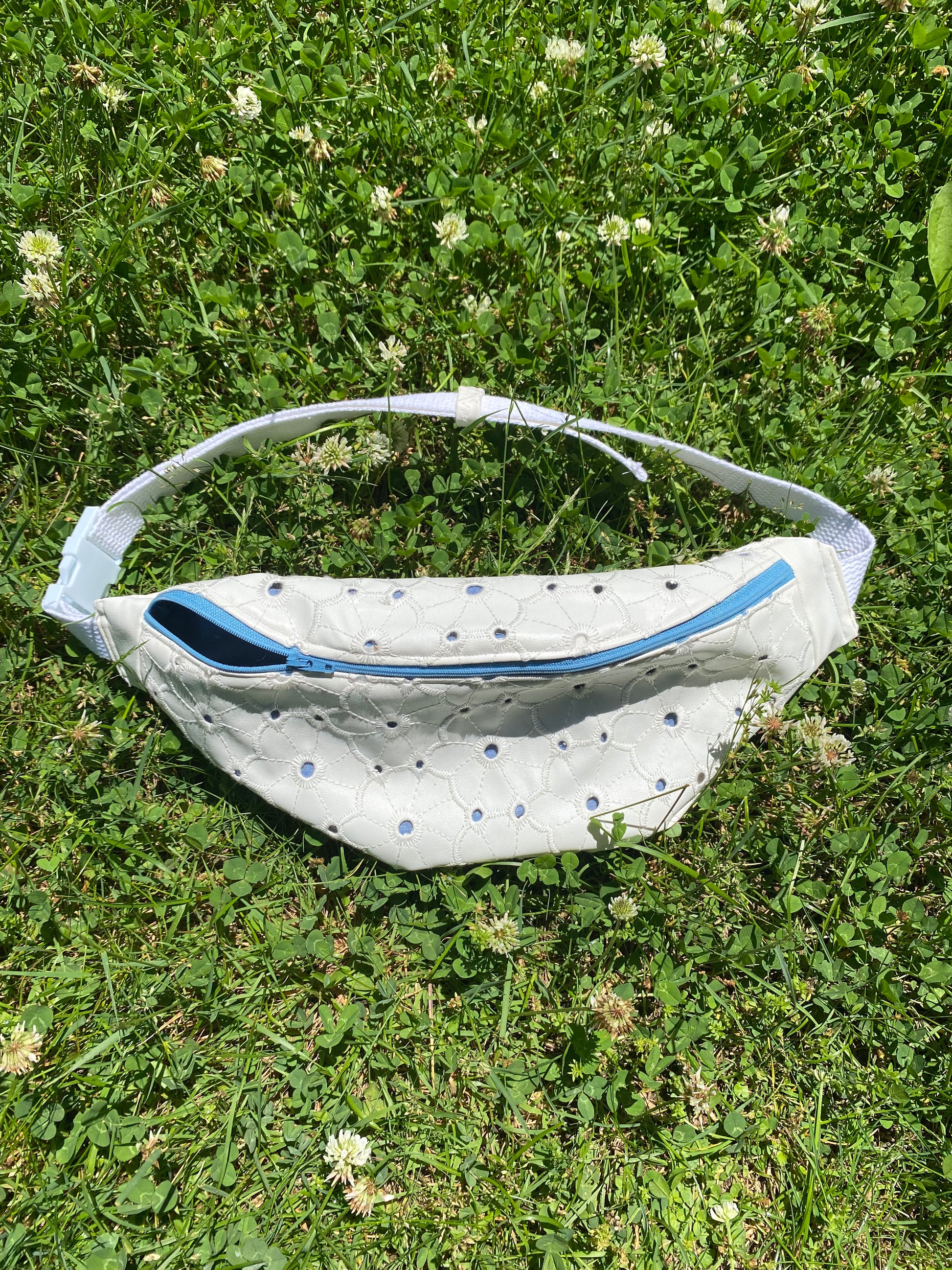 Handmade from remnants of white faux leather eyelet and lined with a light blue cotton, matching light blue zipper and a white cotton adjustable strap. This fannypack is the perfect everyday bag.