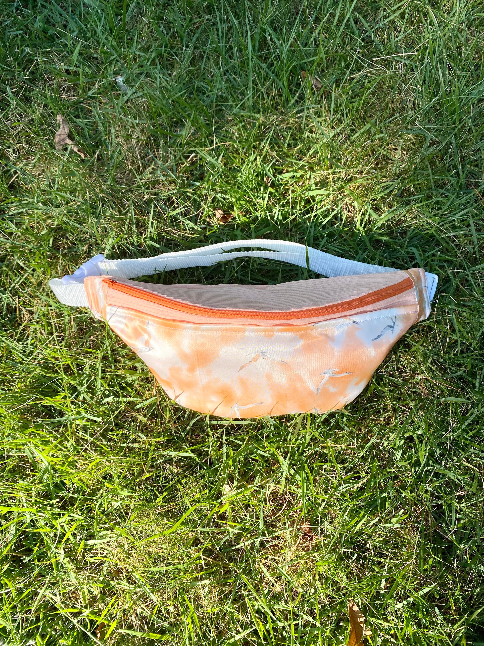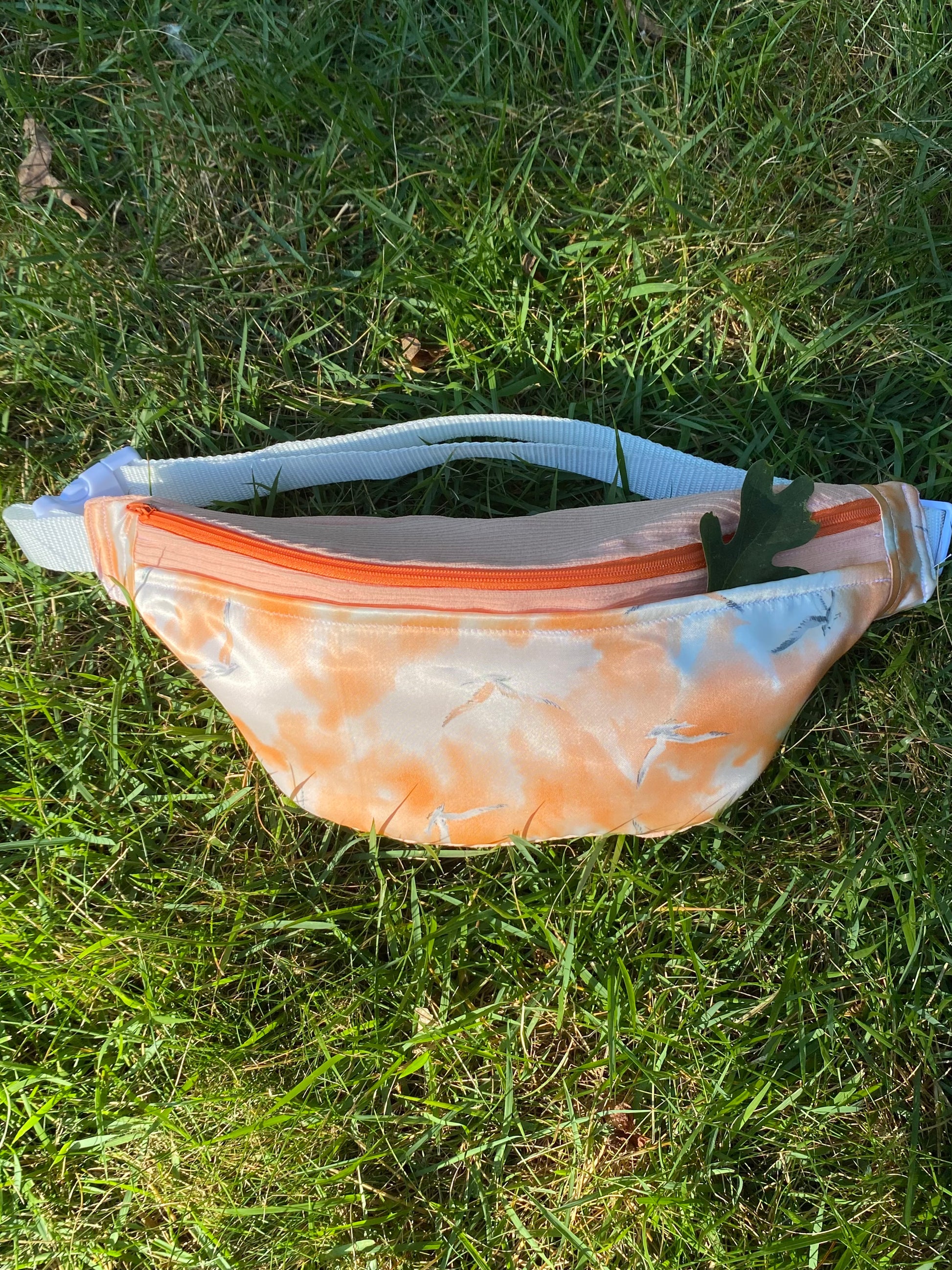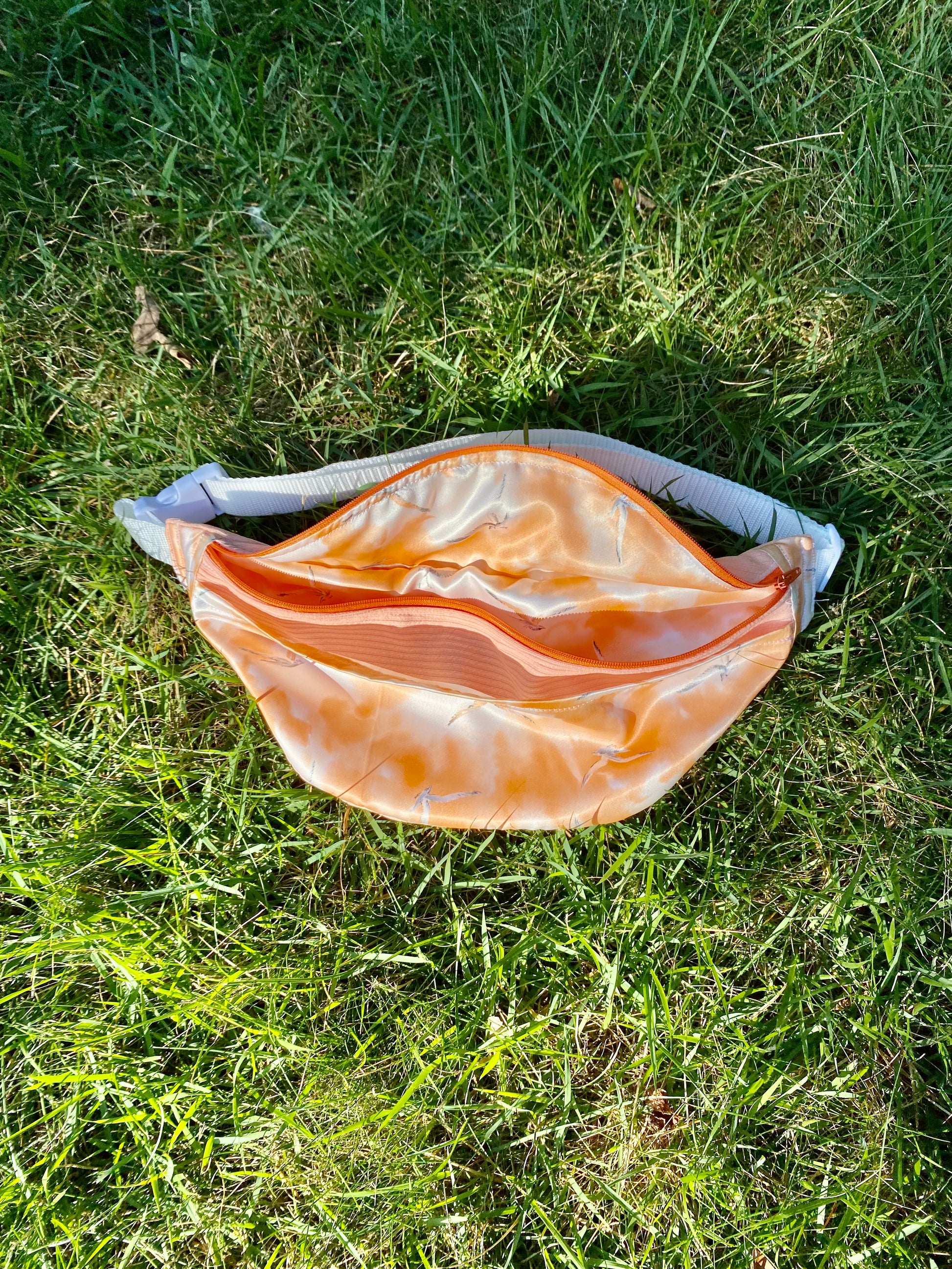 I designed this fannypack with an extra pocket on the outside for easy hands free access to your essentials. The body of the fannypack is made from peach rubbed fabric & peach and white satin with little flying birds. It has a white nylon adjustable strap and plastic buckle so it can be worn crossbody or around the hips.