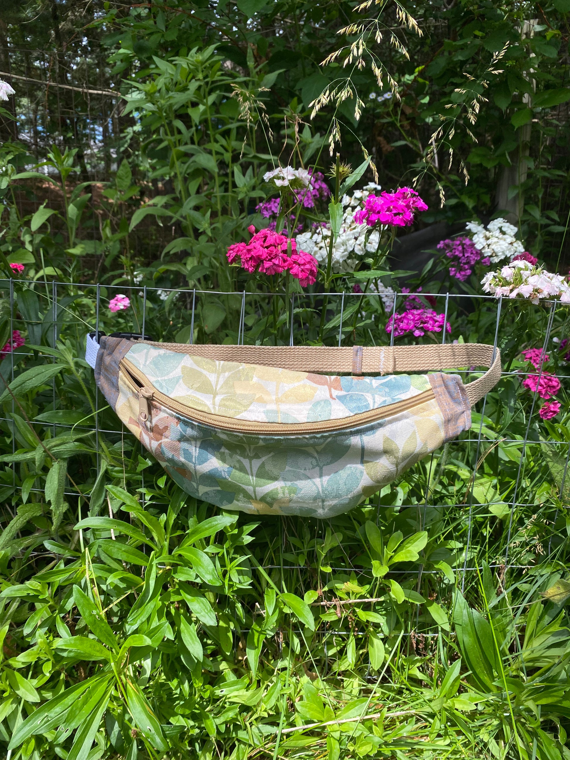 The body of this fannypack is a light tan with yellow, green, blue and brown foliage print, the side panels are blue with brown woven. Trimmed with with and tan cotton adjustable strapping, and a white plastic buckle this piece is perfect for a hike or harvest. This bag can be worn crossbody or around your hips.