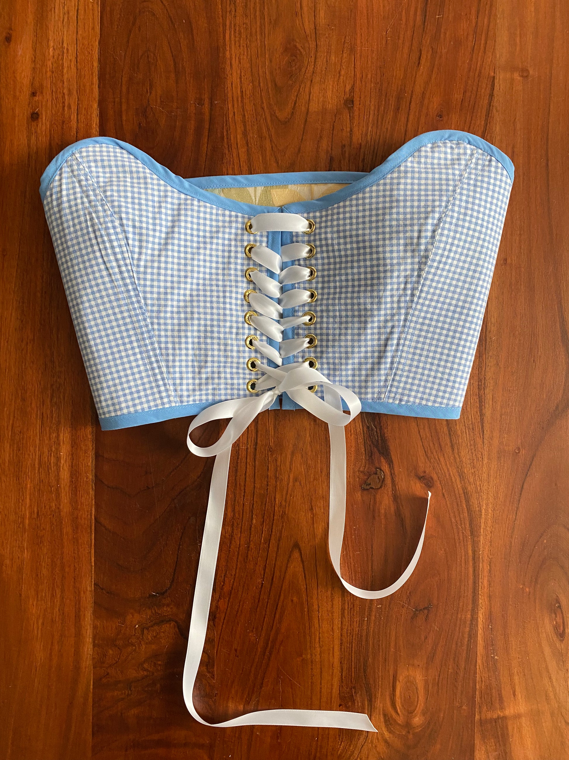 This strapless reversible corset has a multi color foliage print framed by a brown & blue woven on one side and a blue gingham on the other.
