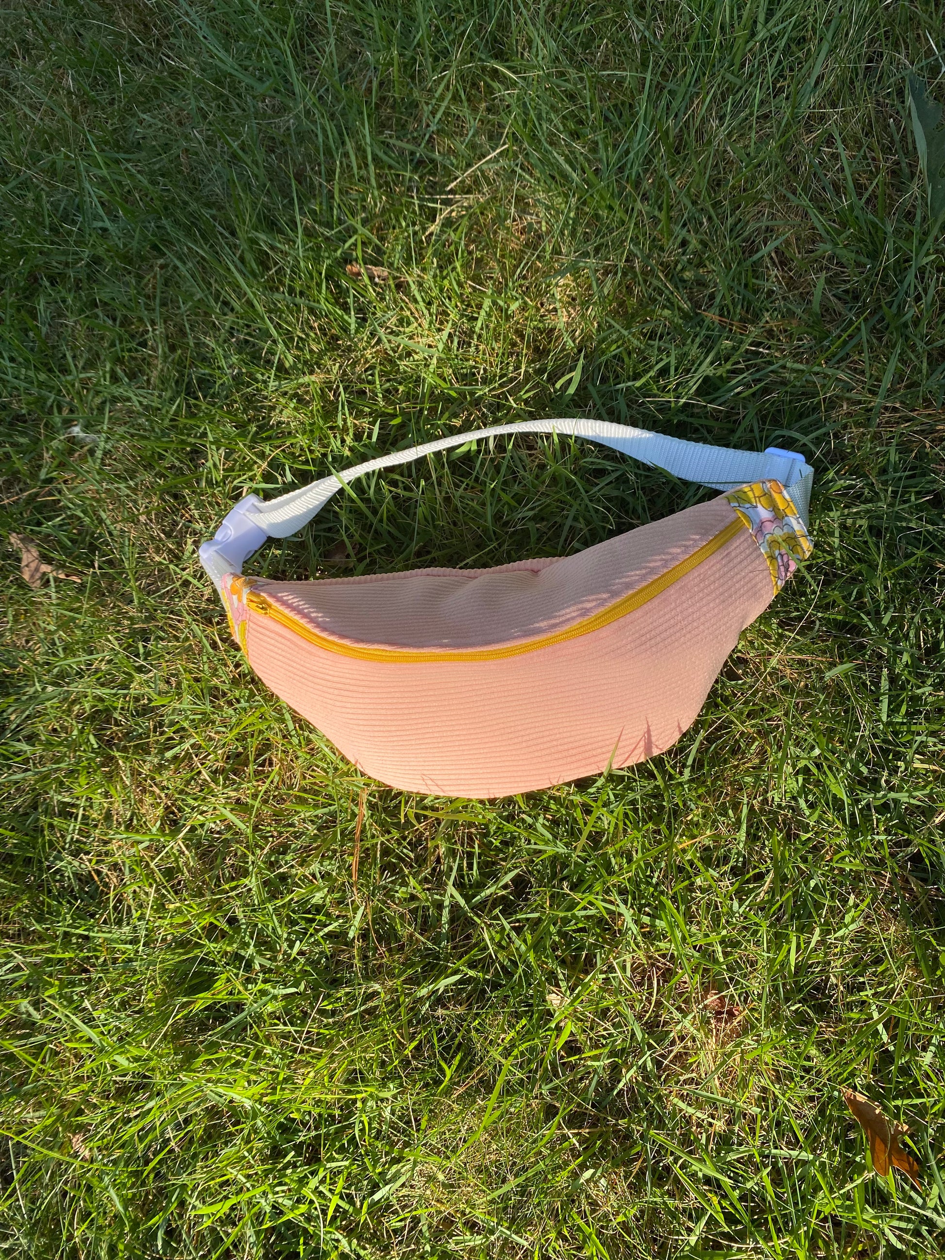 The body of this fannypack is peach ribbed with side details of 70's floral, lined with peach cotton. The adjustable nylon strap also has a plastic buckle so you can easily wear on your hips or crossbody.