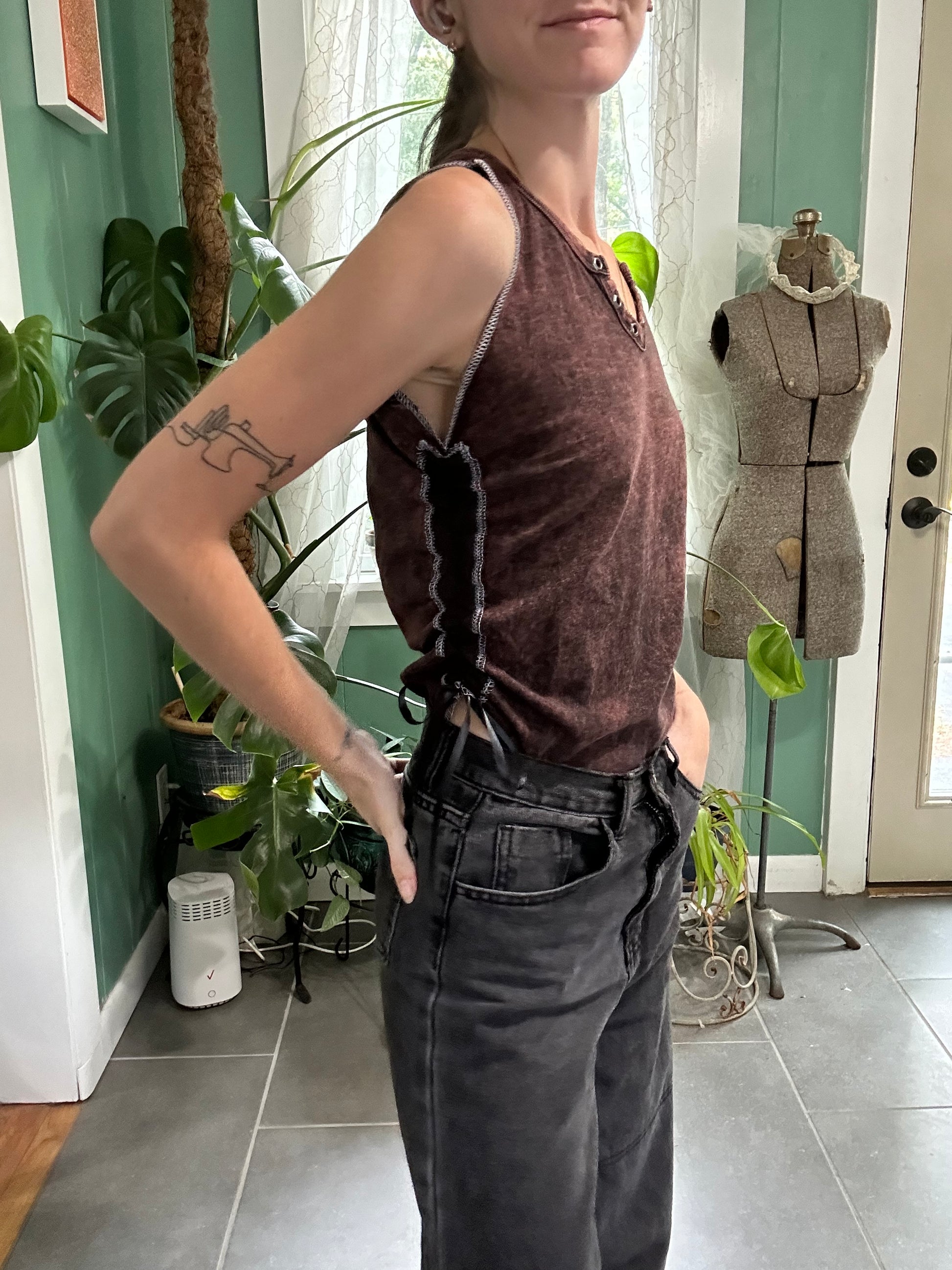 Handmade from an upcycled t-shirt, this body suit has ribbons on the side seams so you can adjust the height of the hip cut. Featuring a snap closure between the legs makes it easy on/off.