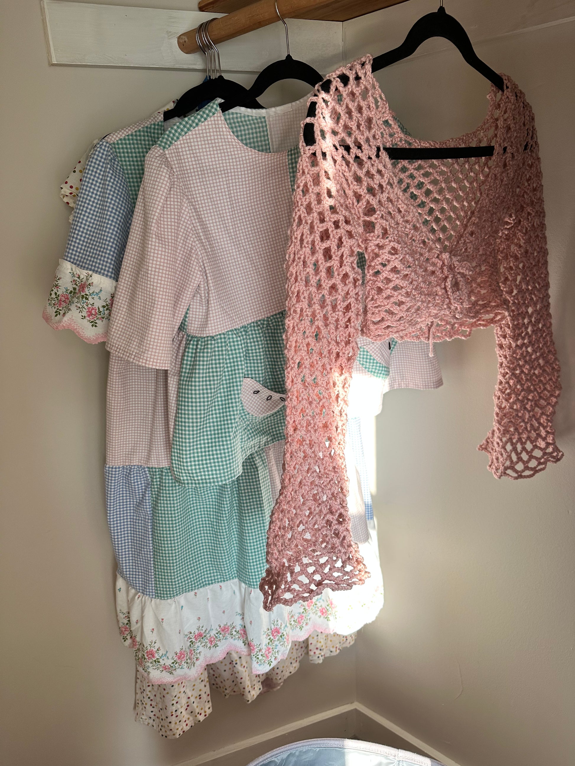 A tiered short sleeve multi color gingham dress with floral accents on the sleeve and hem