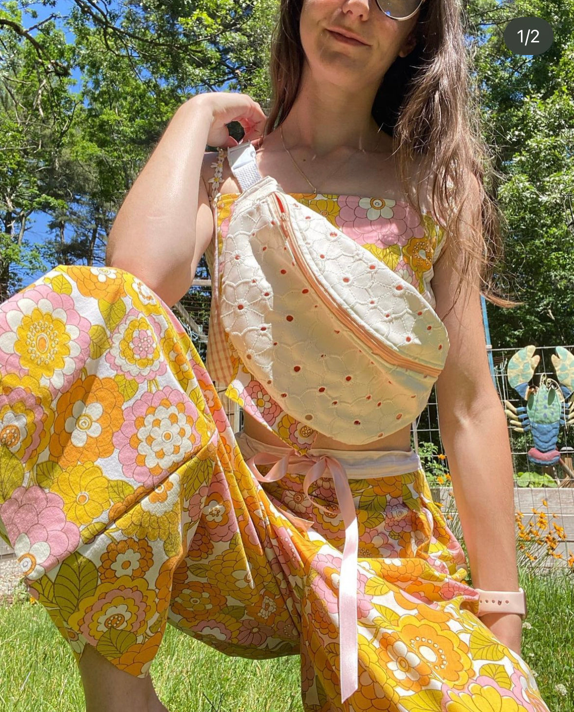 Wide leg 70s floral pants with a pink pin stripe panel going down the side seams. Finished with a pink satin ribbon draw string.